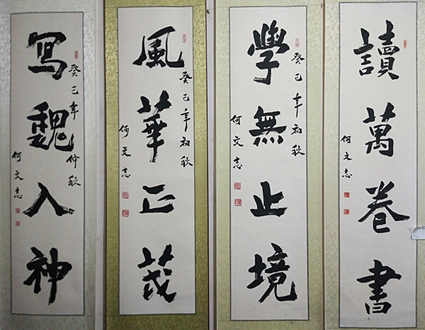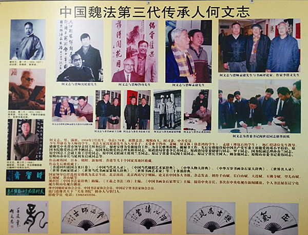 書法家簡介:何文志,男,滿族,1958年2月出生,祖籍蓋縣北海東坡子,現(xiàn)遼寧省鞍山人,中共黨員。少年為康有為先生學(xué)生、書法大師沈延毅先生入室弟子,又受教于啟功、蕭嫻、張仃、屈義林、楊仁愷、孟庸、康殷,諸位大師先生教導(dǎo),學(xué)書初由唐楷、歐陽詢?nèi)胧郑罅?xí)張遷、衡方、石門頌、魏碑龍門二十品等,朝夕精寫,骨氣通達(dá),筆力雄強(qiáng),斧劈刀削般的書法藝術(shù)形象,走出精辟而獨(dú)到的自已風(fēng)格,自創(chuàng)一家。入編香港回歸祖國萬米巨卷,中國當(dāng)代楹聯(lián)藝術(shù)家大辭典,中華人物大辭典,世界名人錄,世界當(dāng)代書畫家篆刻家大辭典等,30多部辭典。論文在中國各大書報(bào)、雜志等發(fā)表,多次在中央電視臺(tái)、新聞播放,個(gè)人書法展在遼寧、鞍山電視臺(tái)播放。是中國楹聯(lián)家協(xié)會(huì)會(huì)員,中國書法家協(xié)會(huì)會(huì)員,遼寧省書法家協(xié)會(huì)會(huì)員。現(xiàn)中國遼南書畫之鄉(xiāng)顧問;沈延毅先生研究會(huì)副會(huì)長;千蓮書畫社社長。