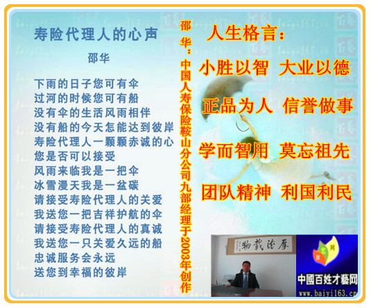 邵華創(chuàng)作的詩(shī)歌《壽險(xiǎn)代理人的心聲》多家媒體采用,在國(guó)內(nèi)保險(xiǎn)界廣為流傳。