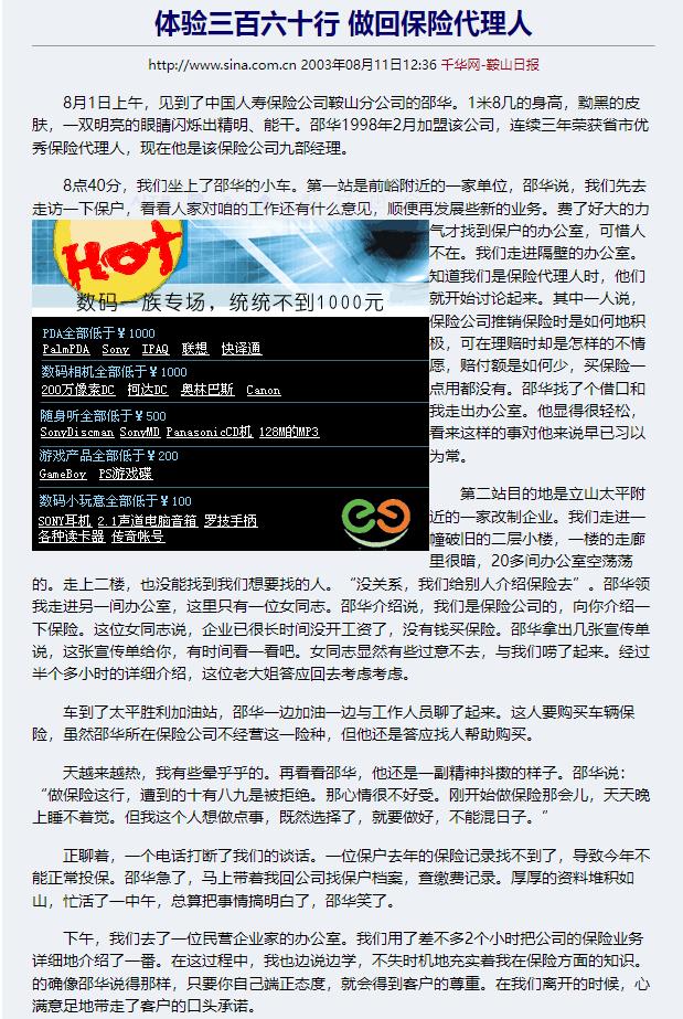 中國(guó)人壽保險(xiǎn)鞍山分公司鋼鐵九部經(jīng)理邵華,1998年2月加盟中國(guó)人壽鞍山分公司。在2001年初挑戰(zhàn)“108”活動(dòng)中,擔(dān)當(dāng)先鋒隊(duì)隊(duì)長(zhǎng),榮獲省市“挑戰(zhàn)108”霸主稱號(hào)、連續(xù)110天上新單業(yè)績(jī),連續(xù)多年遼寧省優(yōu)秀主管稱號(hào)。鞍山電視臺(tái)采訪:保險(xiǎn)英雄-邵華。他在中國(guó)人壽保險(xiǎn)鞍山分公司做保險(xiǎn)13年,帶領(lǐng)過120人營(yíng)銷團(tuán)隊(duì)、12個(gè)營(yíng)銷科,在北大參加全國(guó)首屆保險(xiǎn)職業(yè)經(jīng)理人培訓(xùn)學(xué)習(xí)結(jié)業(yè)。