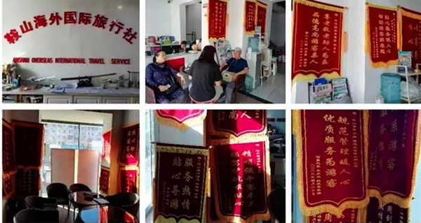 在總部游客接待室,首先映入眼簾的是掛在墻壁上的一面面錦旗,于洋和幾名員工正在柜臺(tái)前熱情地接待游客。趁于洋讓我們稍等的片刻,我仔細(xì)看著墻壁上印有“尊老敬老助人為樂(lè),品德高尚游客親人”、“貼心服務(wù)暖人心,幫助游客解難題”、“導(dǎo)游盡職盡責(zé),時(shí)代青年楷模”等詞語(yǔ)的錦旗。不久,于洋送走了游客與梅美齡一起接待了我們。于是,我們的談話便從掛在墻壁上的錦旗開(kāi)始。她見(jiàn)我指著錦旗表示贊許時(shí),謙虛地說(shuō),錦旗表達(dá)了游客的心意和心聲,也是我們應(yīng)該做的,更是一種鞭策和鼓勵(lì)。然后她向我們介紹了她和她的旅行社。