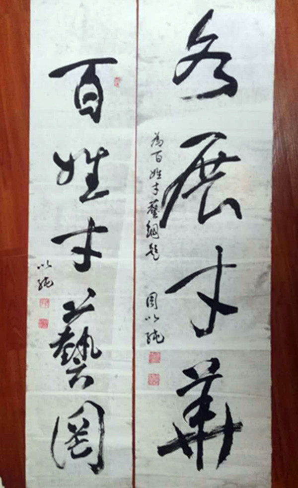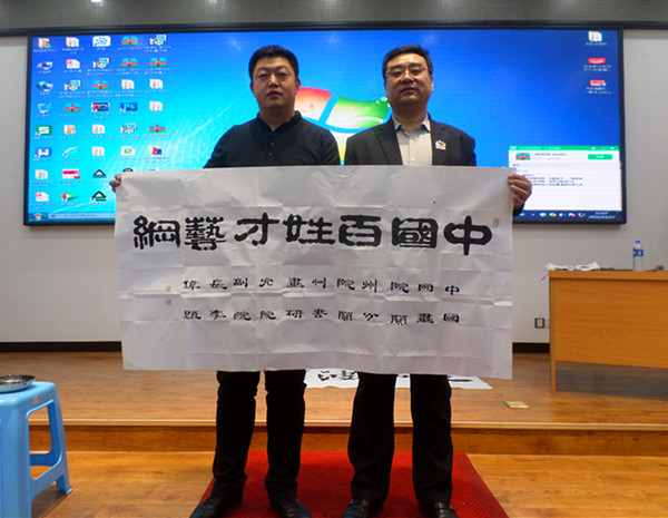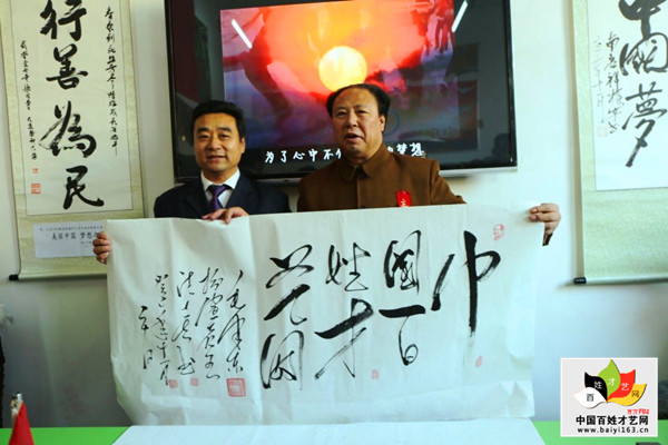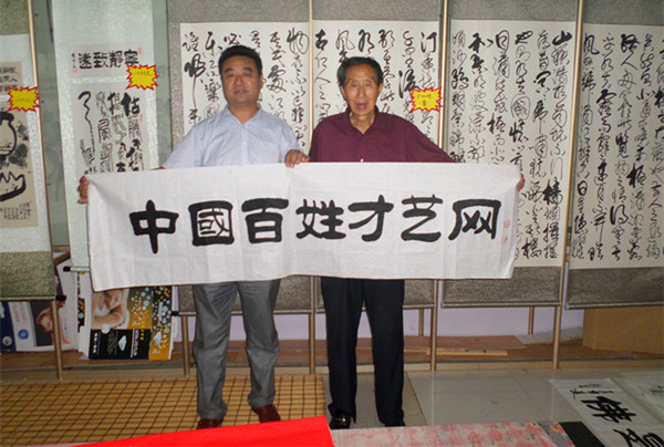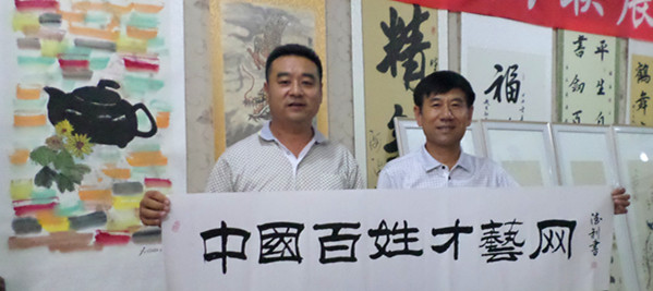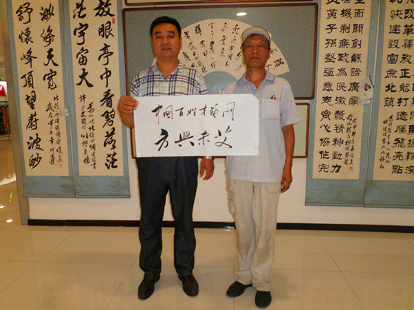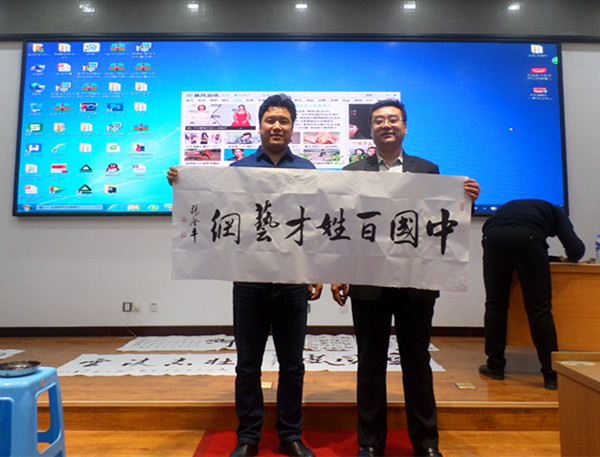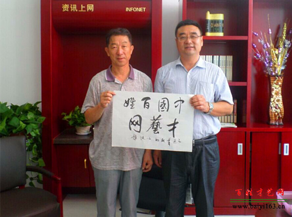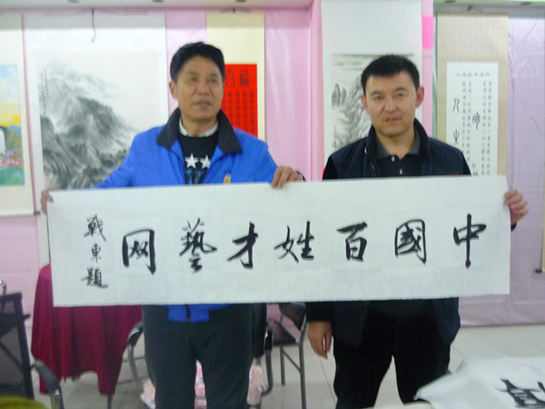 32、書法家戰(zhàn)東(右)為百姓才藝網(wǎng)題字