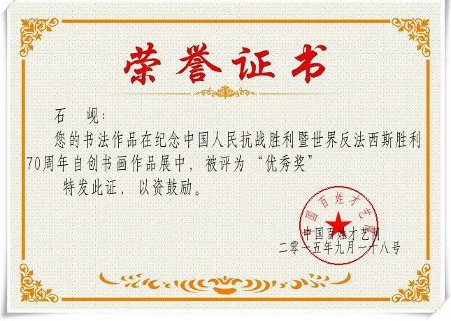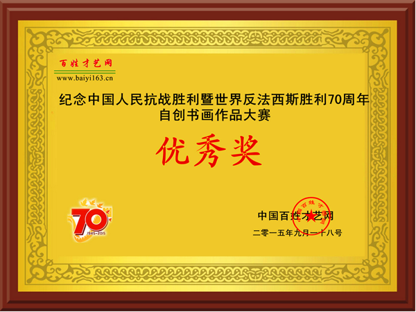 石現(xiàn):您的書法作品在紀念中國人民抗日戰(zhàn)爭暨世界反法西斯戰(zhàn)爭勝利70周年自創(chuàng)作品展中,被評為“優(yōu)秀獎”特發(fā)此證,以資鼓勵。