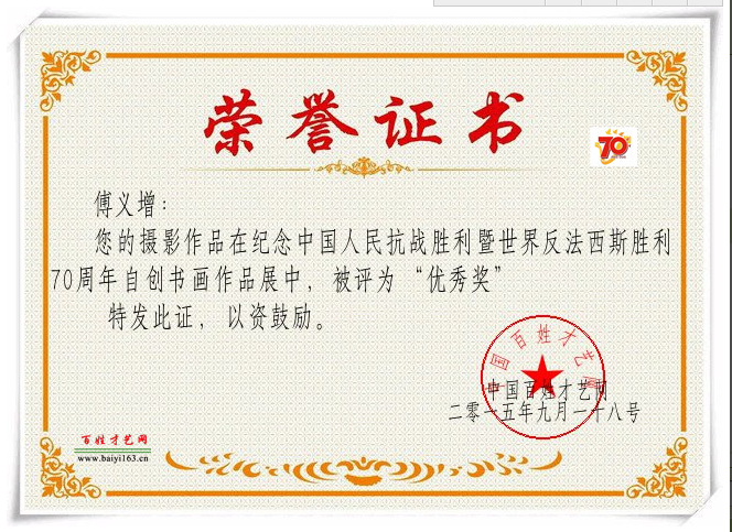 傅義增:您的攝影作品在紀念中國人民抗日戰(zhàn)爭暨世界反法西斯戰(zhàn)爭勝利70周年自創(chuàng)作品展中,被評為“優(yōu)秀獎”特發(fā)此證,以資鼓勵。
