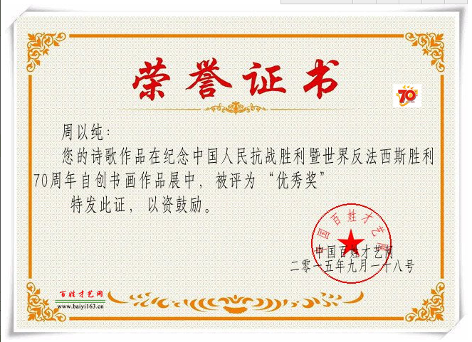 周以純:您的詩歌作品在紀念中國人民抗日戰(zhàn)爭暨世界反法西斯戰(zhàn)爭勝利70周年自創(chuàng)作品展中,被評為“優(yōu)秀獎”特發(fā)此證,以資鼓勵。