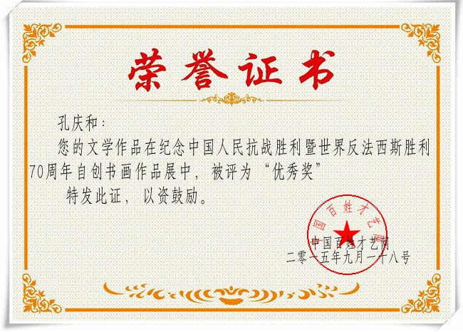 孔慶和:您的文學作品在紀念中國人民抗日戰(zhàn)爭暨世界反法西斯戰(zhàn)爭勝利70周年自創(chuàng)作品展中,被評為“優(yōu)秀獎”特發(fā)此證,以資鼓勵。