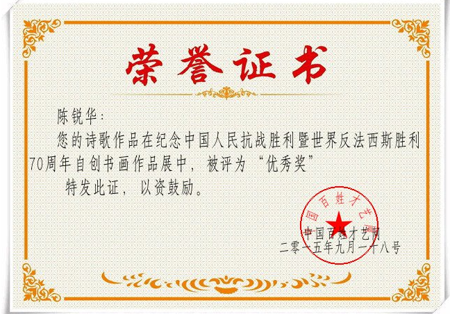 陳銳華:您的詩歌作品在紀念中國人民抗日戰(zhàn)爭暨世界反法西斯戰(zhàn)爭勝利70周年自創(chuàng)作品展中,被評為“優(yōu)秀獎”特發(fā)此證,以資鼓勵。