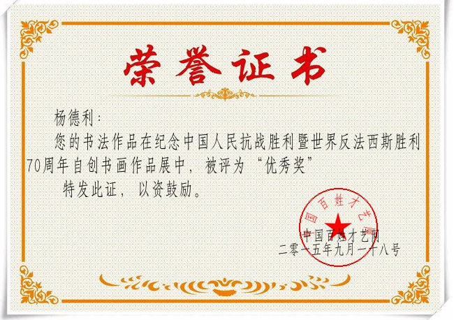 楊德利:您的書法作品在紀念中國人民抗日戰(zhàn)爭暨世界反法西斯戰(zhàn)爭勝利70周年自創(chuàng)作品展中,被評為“優(yōu)秀獎”特發(fā)此證,以資鼓勵。