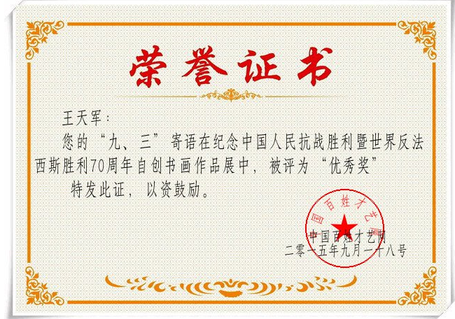 王天軍:您的"九.三"寄語作品在紀念中國人民抗日戰(zhàn)爭暨世界反法西斯戰(zhàn)爭勝利70周年自創(chuàng)作品展中,被評為“優(yōu)秀獎”特發(fā)此證,以資鼓勵。