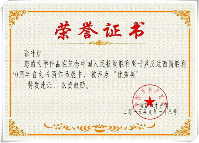 張葉紅:您的文學作品在紀念中國人民抗日戰(zhàn)爭暨世界反法西斯戰(zhàn)爭勝利70周年自創(chuàng)作品展中,被評為“優(yōu)秀獎”特發(fā)此證,以資鼓勵。