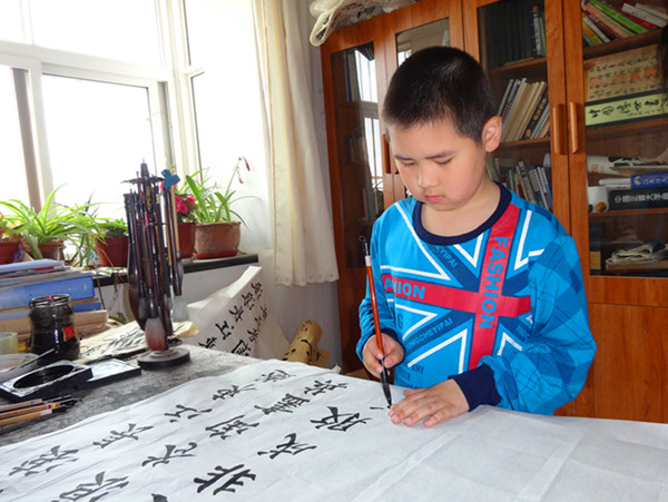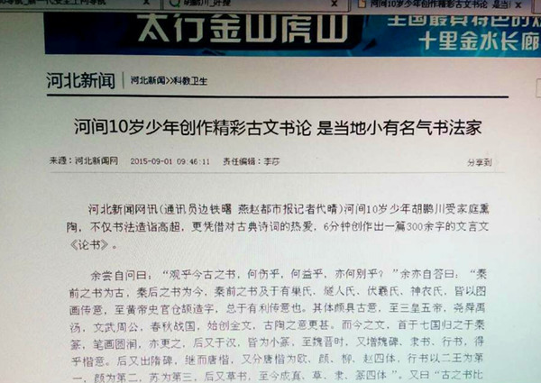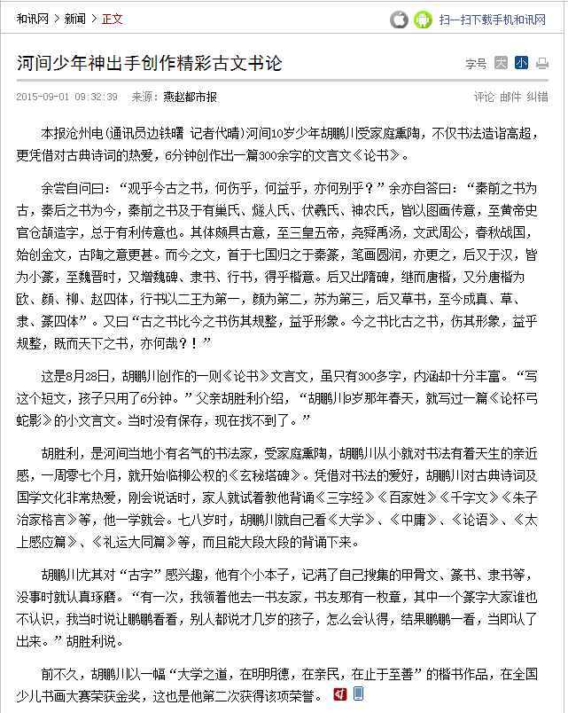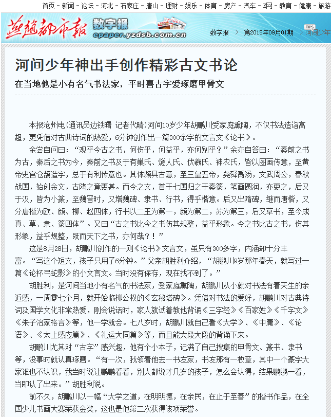 河間10歲少年胡鵬川受家庭熏陶,在當(dāng)?shù)厮粌H是小有名氣的書法家,平時還喜歡古字,愛琢磨甲骨文。更憑借對古典詩詞的熱愛6分鐘創(chuàng)作出一篇300余字的文言文《論書》,在當(dāng)?shù)匾饦O大反響。我們中國百姓才藝網(wǎng)記者在北京有幸結(jié)識其父胡勝利。著名書法家胡勝利的兒子胡鵬川,今年10歲,兒子才華橫溢,喜歡文學(xué)、喜歡書法藝術(shù),他小小年紀(jì)的書法作品經(jīng)常參展、作文也經(jīng)常得到老師和同學(xué)們稱贊。