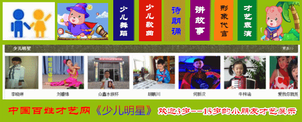 百姓才藝網(wǎng)開通《少兒明星》欄目就是為3至15歲之間的孩子們提供才藝展示的平臺,讓孩子們享受快樂的童年生活。歡迎少兒舞蹈、器樂演奏、少兒英語、講故事、形象代言人、少兒歌曲、詩歌朗誦等各種才藝的小朋友參加。