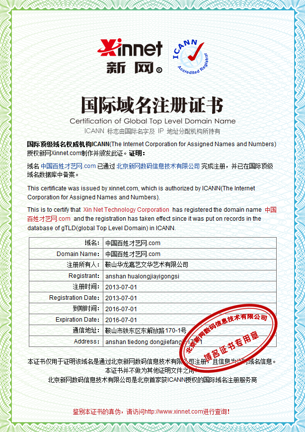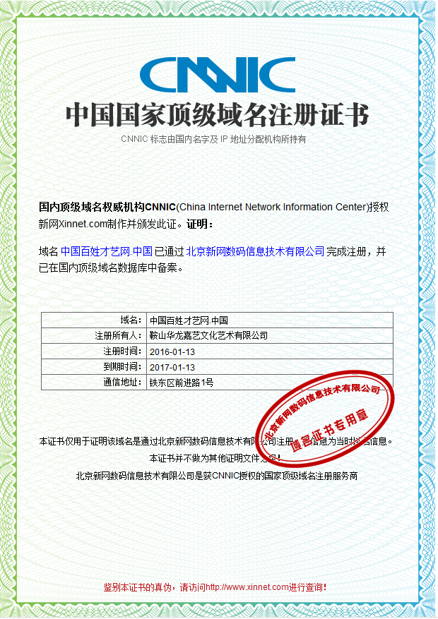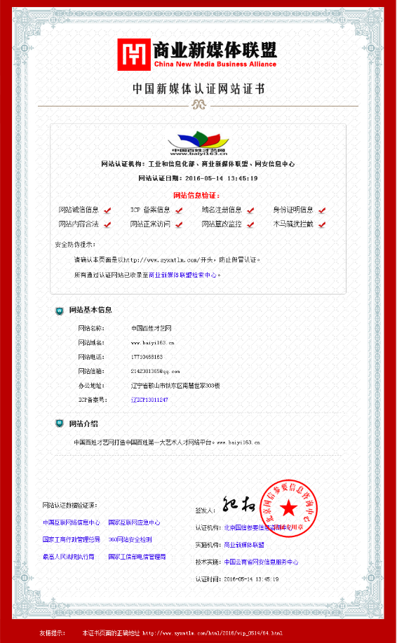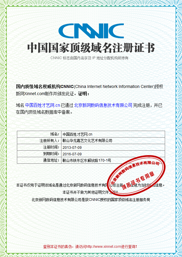 百姓才藝網成立2010年5月20日創(chuàng)始人邵華總裁申請了《百姓才藝網》網站,經中華人民共和國工業(yè)和信息化部注冊備案通過,備案號為:遼ICP13011247。從創(chuàng)建起初的六個欄目、經過四次網站升級,發(fā)展到現在開播的49個頻道及一個子網站(百藝聯盟網www.baiyi163.com)