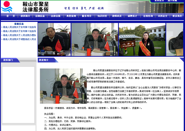 鞍山市聚星法律服務所有嚴密的組織領導機構,嚴格的組織紀律,實行規范化管理,為企業、公民合法權益和經濟利益提供有力的法律保障和法律援助,以最上乘的法律服務,讓你放心,讓你滿意。該所全體工作人員熱誠歡迎你們的到來。