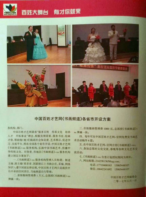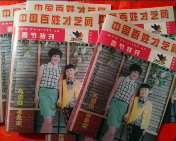 大16開34頁、銅版紙彩印的百姓才藝網(wǎng)春節(jié)特刊,重點描述了百姓才藝網(wǎng)創(chuàng)辦七周年的豐富歷程,全面展示了百姓明星、少兒新星、書畫名家、人物專訪、會員展示、企業(yè)家風采、慈善公益、文學作品等精彩內(nèi)容,及時把黨的聲音、百姓藝術(shù)傳播到機關(guān)學校、藝術(shù)團體、部隊、廠礦、環(huán)衛(wèi)工人等手中。