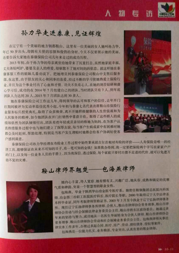 孫麗華走進泰康、見證輝煌 鞍山律師界翹楚-----包海燕律師