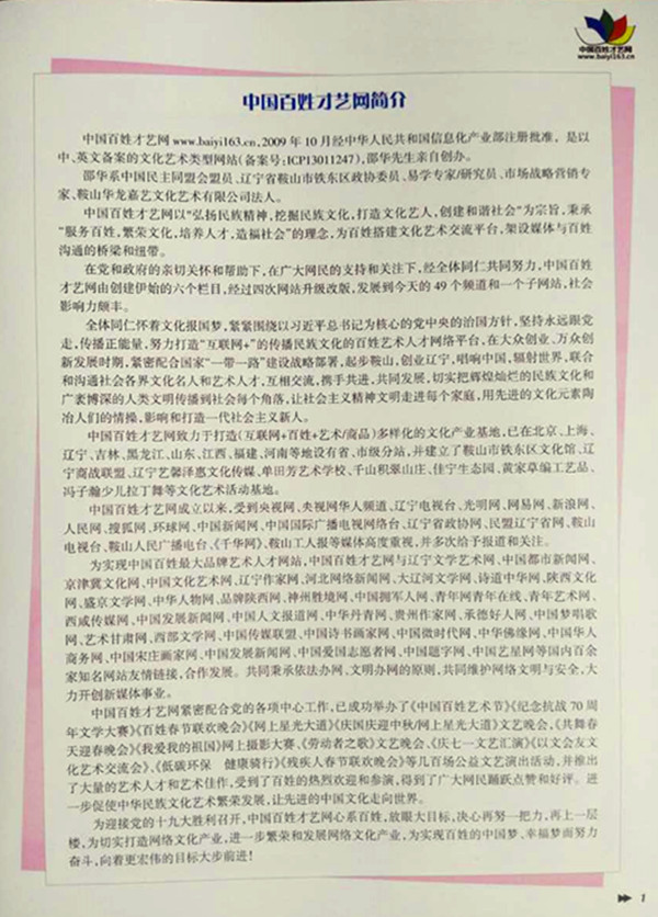 《特刊》內(nèi)容與百姓才藝網(wǎng)官方網(wǎng)站同步刊載,中國百姓才藝網(wǎng)刊物、QQ群、微信群、公眾號、微博、優(yōu)酷視頻及線下等同步推廣宣傳。