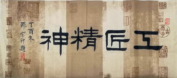 如果談表演藝術(shù)里的模擬借鑒是以生活為第一源泉的話,而書法藝術(shù)的稀奇特征,決定了以世存的碑帖墨跡為其第一源泉,古來書苑里艷傳著公孫大娘舞劍器,懷素觀夏云多奇峰等等,字外求字而使書藝大進的故事。這等高級的打通行當,串穴補益的轉(zhuǎn)化本領(lǐng),只有觀千劍而后曉器者方得其法門。道友寶印便得其一二。他務(wù)求扎扎實實地,一門心思地從模擬前賢及時人高妙的作品入門,他深識舍此則是不得法門,由臨摹入手、逐漸理解,把握所學范本的用筆結(jié)體、行氣、章法,乃至于氣質(zhì)格調(diào)風神,從而使自己一窮二白的心手充實起來,堅厚起來,鞏固下來。他的書法得力于藝術(shù)創(chuàng)作之間的“悟”和來自于篆刻的拙意手法。寶印賢棣的書法主要特點為:暢其威銳,有如鏤鐵,充滿著自然天趣,即使在一個字中,筆畫的組合也不是孤立僵死的,而是起承轉(zhuǎn)合,有呼有應(yīng),充滿著自然生動的逸趣。作筆蒼古渾穆,用筆點畫間都有一種質(zhì)感。寶印運筆始終運用中鋒,忌用偏鋒,用筆形似方折,但筆致篤厚,轉(zhuǎn)持自然,線條挺勁有力,這些都非中鋒運筆難以達到的。至于用中鋒寫方筆,這主要取決于對筆尖和筆肚的和諧調(diào)理,但他絕非偏鋒所致。不囿于陳規(guī),不人俗套,償試著以篆法作楷,于是其字又具篆書之渾穆,又合楷法之峻厲,加之其敏銳的藝術(shù)思維,形成氣息之生澀、姿態(tài)之奇?zhèn)ブL格。同時,卓絕的題款小字,宇態(tài)拙樸無華,生澀的用筆和結(jié)字中,往往造出一絲冷峻肅穆的氣息,使通篇格調(diào)顯得古茂拙樸——與他的篆刻相吻——廖廖幾刀便是一種樸實無華的意境。