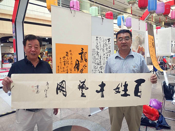73、2020年7月1日,遼寧沈陽書法家馬秉忠(左)為百姓才藝網(wǎng)題字。