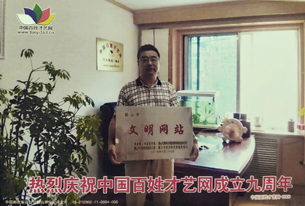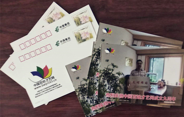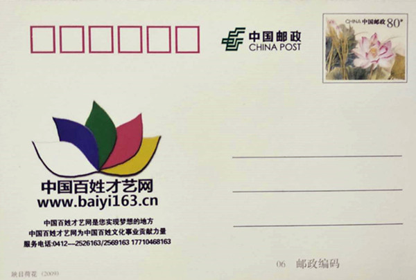 明信片一套一枚,主圖為百姓才藝網(wǎng)總編輯邵華手捧中共鞍山市委宣傳部頒發(fā)的文明網(wǎng)站牌匾。下方為:熱烈慶祝中國(guó)百姓才藝網(wǎng)成立九周年。中國(guó)郵政郵資明信片國(guó)家編號(hào)為:18—210302—11—0004—000,百姓才藝網(wǎng)編號(hào)—0009。背面為郵資圖案:映日荷花,郵票面值:0.80元,可以郵寄到全國(guó)各地。郵資左下方為:百姓才藝網(wǎng)標(biāo)識(shí)、網(wǎng)址、百姓才藝網(wǎng)是您實(shí)現(xiàn)夢(mèng)想的地方、百姓才藝網(wǎng)為中國(guó)百姓文化事業(yè)貢獻(xiàn)力量。服務(wù)電話:0412—2526163/2569163 17710468163等信息。