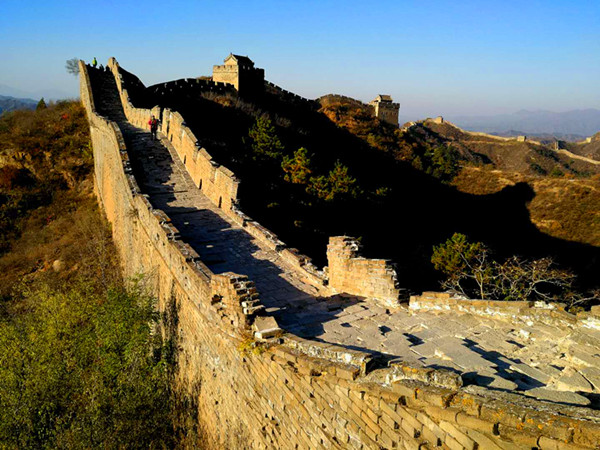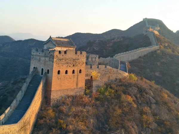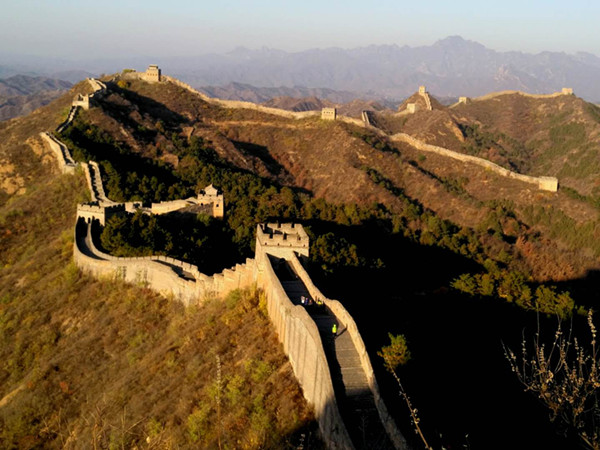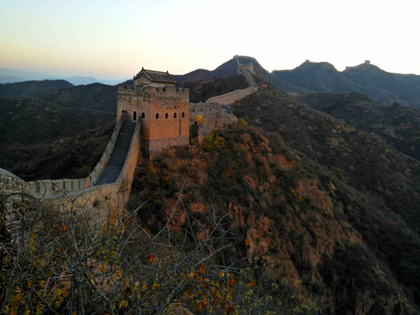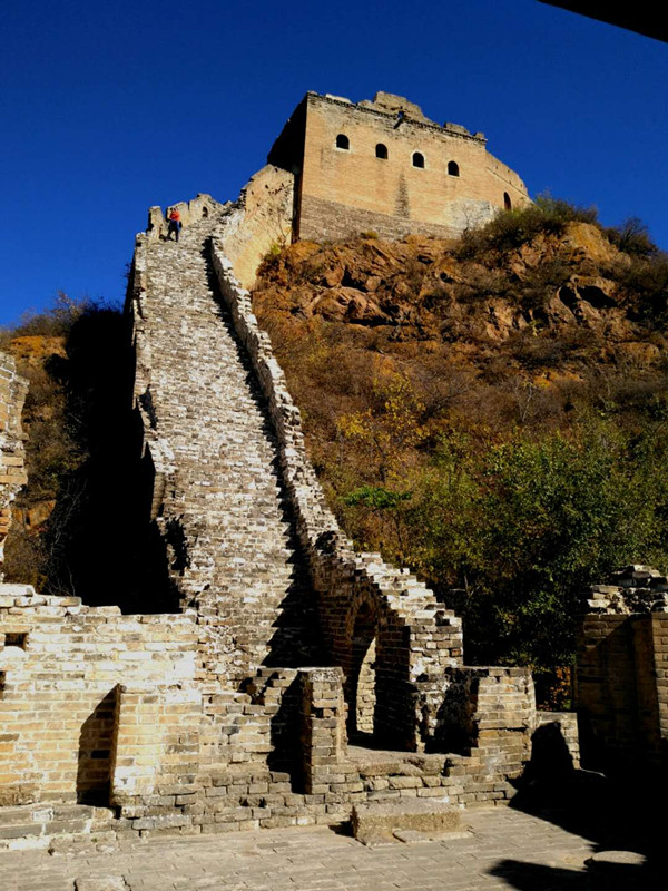金山嶺長(zhǎng)城橫亙于河北省承德市灤平縣境內(nèi),此段長(zhǎng)城東接燕山山脈第一峰,似蛟龍躍于山峰間,西面如臥虎威風(fēng)龐然,南面水庫(kù)波光粼粼似明鏡高懸,北面山濤蜿蜒似玉帶纏綿。這里春天姹紫嫣紅,夏天水潺林蔥,秋天碩果豐盈,冬天銀裹傲迎,好一派北國(guó)風(fēng)光妖嬈壯美。