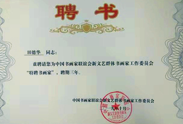 2013年書法作品被《盛世收藏紅色寶典——當(dāng)代中國書畫名家鑒賞》收錄。2014年與藝術(shù)大家合出《留香——聚焦中國當(dāng)代書畫名家十人集》、《弘揚經(jīng)典,推崇名家》中華國禮藝術(shù)名家精品掛歷。作品入選法國、美國,中國郵政、電信各部門集郵中心出版發(fā)行的6套紀(jì)念珍藏郵冊,其中2015年“慶祝中美建交36周年”出版發(fā)行《中美杰出華人田德華郵票紀(jì)念珍藏冊》并榮獲“中美杰出華人藝術(shù)家”榮譽證書。在2017年參加“不忘初心繼續(xù)前行——喜迎黨的十九大”活動,榮獲“喜迎十九大——中國當(dāng)代書畫藝術(shù)名家”榮譽證書,其書法作品被《中國郵冊》收錄。