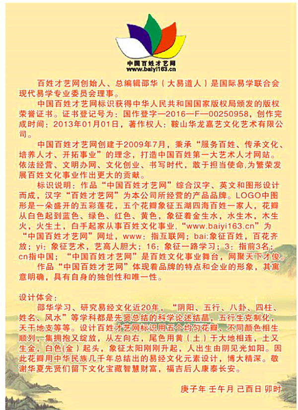 邵華學(xué)習(xí)、研究易經(jīng)文化近20年,“陰陽(yáng)、五行、八卦、四柱、姓名、風(fēng)水”等學(xué)科都是先賢總結(jié)的科學(xué)論述結(jié)晶,五行生克制化,天干地支等等。我設(shè)計(jì)百姓才藝網(wǎng)標(biāo)識(shí)用五個(gè)均勻花瓣、不同顏色相生順列,集擁抱又綻放,從左向右,尾色用黃(土)于大地相連,土又生金(白色),白色金起頭,象征太陽(yáng)剛剛升起,因此花瓣用中華民族幾千年總結(jié)出的易經(jīng)文化設(shè)計(jì),博大精深。敬謝華夏先賢留下文化寶藏智慧財(cái)富,福吉后人康泰長(zhǎng)安。