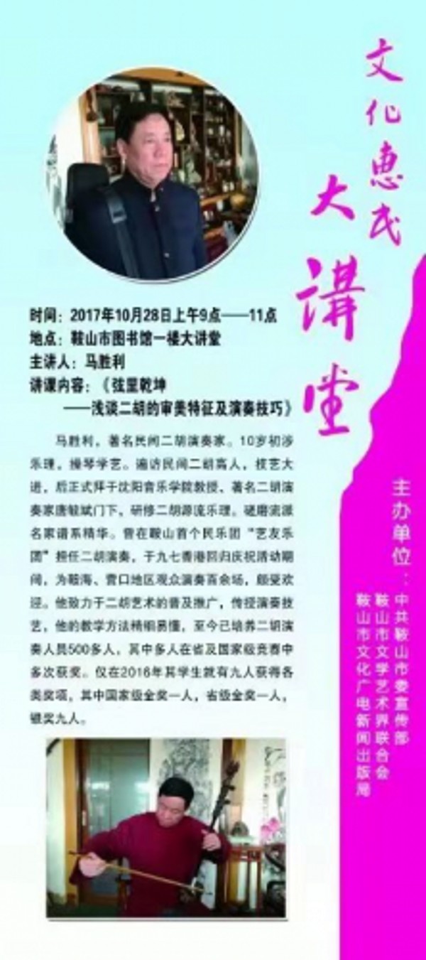 2018年在鞍山市文聯(lián)組織的“文化大講堂”講授二胡的發(fā)展史與如何演奏