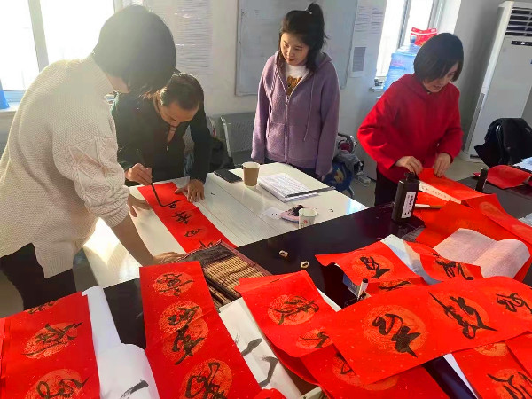 1966年參加中國共產(chǎn)黨的老黨員李喜林看在眼里,記在心上,在喜迎建黨100周年和新春佳節(jié)的前夕到裕民社區(qū)揮毫潑墨,寫下了“鼠去牛來辭舊歲,龍飛鳳舞賀新春”、“數(shù)聲牧笛傳新曲,四野耕犁試早春”、“為民當(dāng)效黃牛力,報國壯懷赤子心”、“黃土田間牛作畫,紫微春苑燕吟詩”、“和順一門盈百福,平安二字值千金”,黨旗飄飄、家國情懷等贊美新生活,撰聯(lián)賀新春,激勵人民公仆為人民辦實事的情懷,借以表達廣大黨員和人民群眾對社區(qū)工作感謝之情。