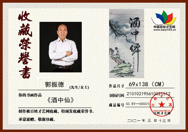 百姓才藝網(wǎng)書畫頻道管理團(tuán)隊(duì),積極為書畫名家推廣宣傳、銷售及收藏,對(duì)網(wǎng)內(nèi)收藏的書畫名家作品給予網(wǎng)上榮譽(yù)公示,頒發(fā)收藏榮譽(yù)書,作為網(wǎng)站對(duì)書畫作者的承蒙惠贈(zèng)、敬謝珍藏。