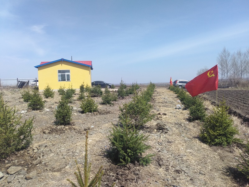 栽植苗木現(xiàn)場,黨旗迎風(fēng)飄揚,黨員干部干勁十足。大家分工合作,栽下了200余棵景觀云杉樹苗,為春天的田野增添了一抹新綠。