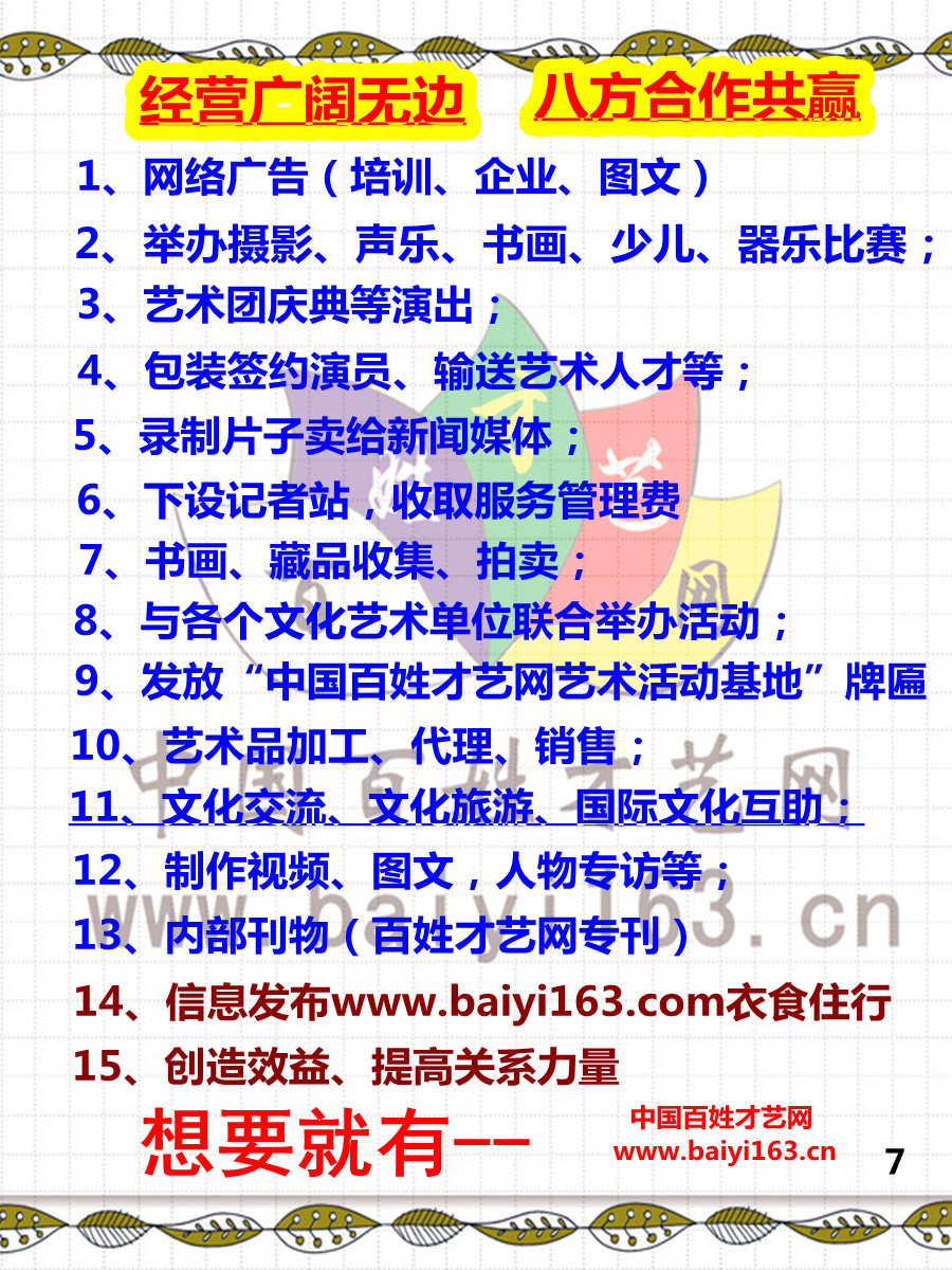 1、凡本網注明“來源:百姓才藝網”的所有作品,版權均屬于百姓才藝網(本網另有聲明的除外);未經本網授權,任何單位及個人不得轉載、摘編或以其它方式使用上述作品;已經與本網簽署相關授權使用協(xié)議的單位及個人,應注意該等作品中是否有相應的授權使用限制聲明,不得違反該等限制聲明,且在授權范圍內使用時應注明“來源:百姓才藝網”。違反前述聲明者,本網將追究其相關法律責任。