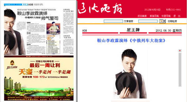 2012年8月30日遼沈晚報A08版報道鞍山李政霖演繹《中俄列車大劫案》