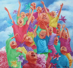 方力鈞作為中國新藝術(shù)潮流最重要的代表人物之一,與這個潮流的其他藝術(shù)家共同創(chuàng)造出一種獨特的話語方式。其中尤以他自1988年以來在一系列作品中所創(chuàng)造的“光頭潑皮”的形象,成為一種經(jīng)典性的語言符號。它標了當(dāng)代人一種人文和心理的感覺。方力鈞通過人物表情的嬉笑和發(fā)呆,或是打哈欠之類的無聊表情,或是他們的背影和後腦勺,使畫面中出現(xiàn)了一種無意義的消解現(xiàn)有意義系統(tǒng),具有叛逆、嘲諷意味的形象。而且,他的光頭形象又多選擇自己、自己的朋友作為模特,使得這種嘲諷成為一種自我嘲諷,因而變成了對意義系統(tǒng)自我逃離的形象。”
