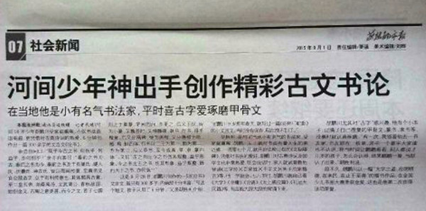 河間10歲少年胡鵬川受家庭熏陶,在當地他不僅是小有名氣的書法家,平時還喜歡古字,愛琢磨甲骨文。更憑借對古典詩詞的熱愛6分鐘創作出一篇300余字的文言文《論書》,在當地引起極大反響。我們中國百姓才藝網在北京有幸認識其父,著名書法家胡勝利才得知其10歲小兒子才華橫溢,甚喜歡.現展其作品。